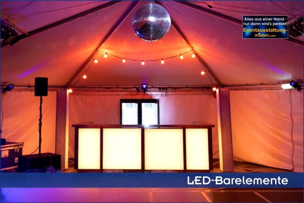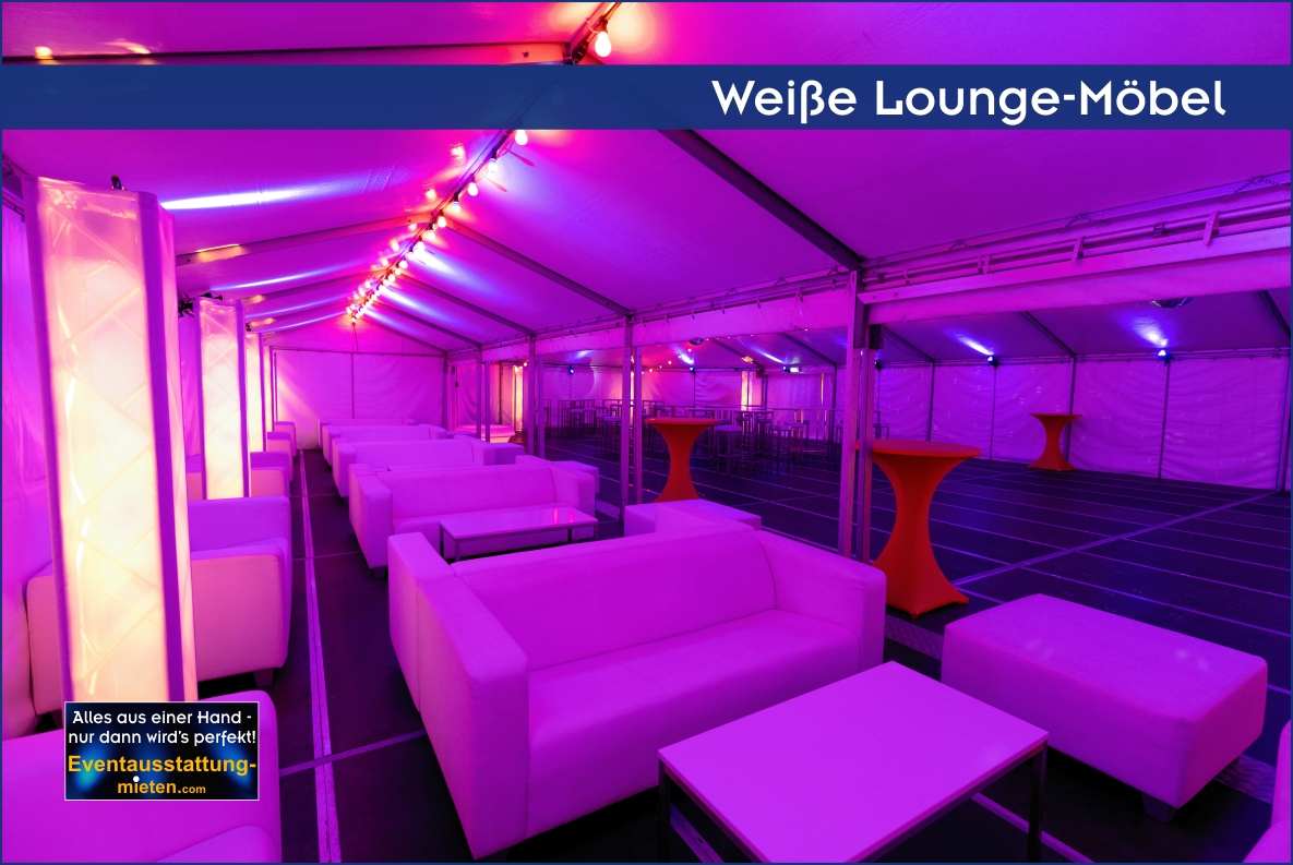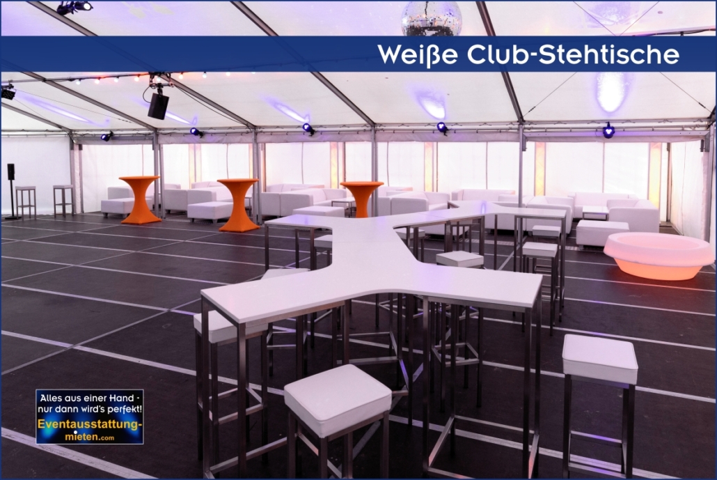 Antwort: Von uns erhalten Sie genau das was Sie bei uns bestellen: Wetterfestes Zelt nach Platzvorgabe, professionelle Licht- und Tontechnik (inkl. Discokugel), exklusives Mobiliar wie weiße Loungemöbel, weiße Club-Stehtische und eine beleuchtete LED-Bar. Auf Wunsch stellen wir auch den passenden DJ für Ihr Firmenfest in Bayern.