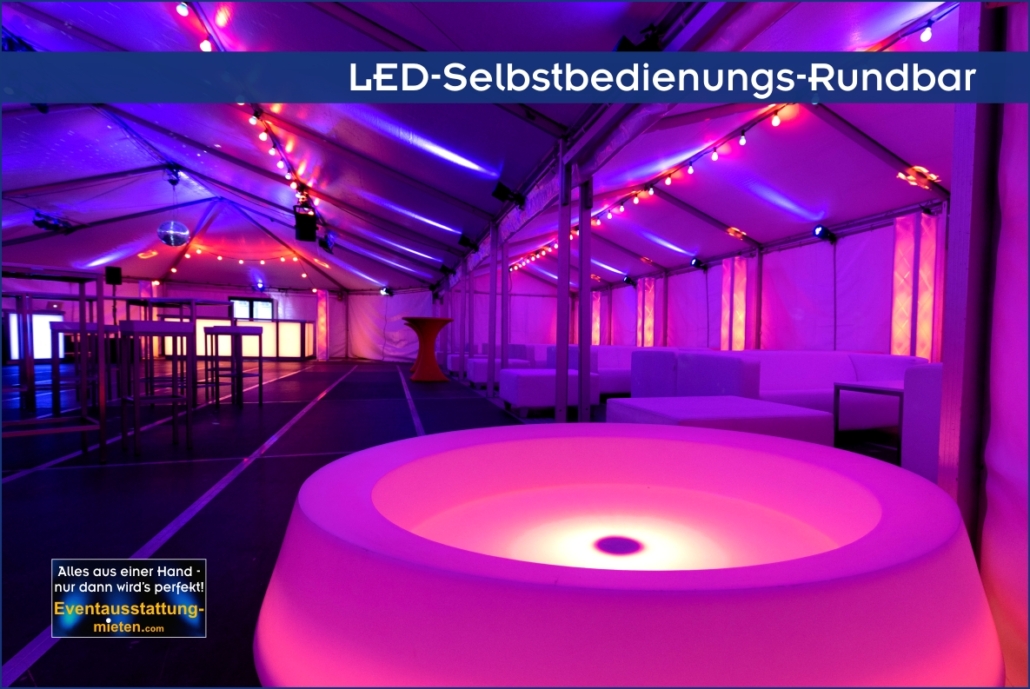 - Mobiliar: Elegante weiße Loungemöbel, hochwertige weiße Club-Stehtische, eine beleuchtete LED-Bar als zentraler Treffpunkt und eine zusätzliche LED-Selbstbedienungs-Rundbar im Lounge-Bereich.